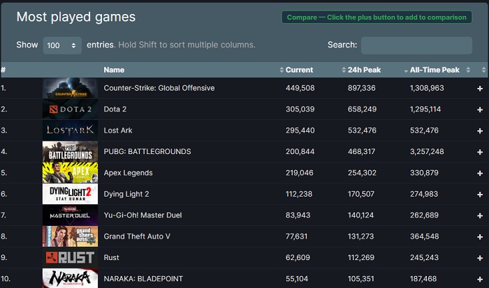 로스트아크 글로벌 서버는 순간적으로 스팀 현재 플레이어 수 1위 게임에 랭크 하기도 했으며, 금일 최고 기록으로 본다 해도 카운터 스트라이크 글로벌 오펜시브와 도타 2에 이은 3위이다. 현재 플레이어 역시 도타 2와 비슷한 수준으로 기록되고 있다.
