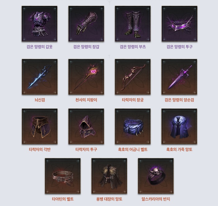 신규 보스 몬스터로부터 획득할 수 있는 주요 아이템으로는 '검은 망령' 시리즈의 전설 등급 신규 장비와 '뇌신검', '천사의 지팡이', '타락자의 장궁', '검은 망령의 양손검', '타락자' 및 '흑호' 시리즈 방어구 등의 영웅 등급 장비가 있다. 해당 아이템은 기존의 전설 등급 및 영웅 등급 장비보다 훨씬 높은 수준을 자랑함에 따라 이용자에게 또다른 목표를 심어주고 파밍의 재미를 느낄 수 있도록 할 것으로 보인다.
