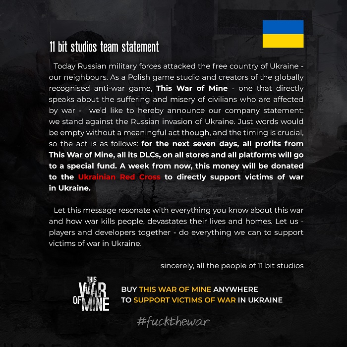 '디스 워 오브 마인(This war of mine)'을 개발한 인디 게임사 '11비트 스튜디오(11bit studios)'가 러시아의 우크라이나 침공에 대해 규탄하는 성명을 발표했다.