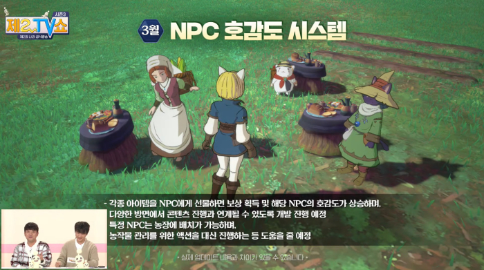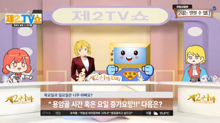제2TV쇼는 제2의 나라 공식 생방송으로 향후 업데이트 내용과 유저들의 의견에 대해 개발진의 생각을을 전하는 자리다. 방송은 정인호와 김정민이 진행했으며, 패널로 마재, 나현, 김효진, 하창봉이 참여했다.