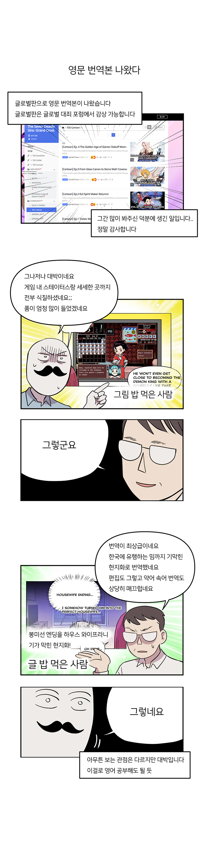 이번 작품은 일곱 개의 대죄 웹툰이 영어 번역을 통해 글로벌 버전 공식 포럼에 공개 된 내용을 다룬다. 국도 작가는 자신의 웹툰이 번역돼 세계에 알려지는 것에 대한 고마움과 함께 3년 가까운 시간동안 연재하면서 있었던 몇몇 애피소드를 공개했다.