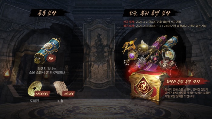 대규모 업데이트인 만큼, 다채로운 보상도 제공된다. 업데이트를 기념해 모든 이용자에게 희생의 빛나는 소울 소환서와 20만 도화전, 5천 비결이 주어지며, 신규 이용자 및 복귀 이용자에게는 희생의 영웅 소울 소환서, 잊혀진 심연의 방어구 선택 상자 등으로 구성된 특별 보상이 지급된다.