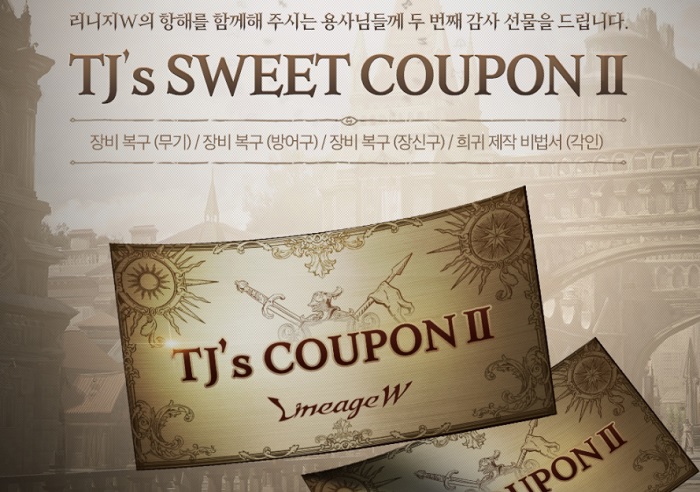 여기에 3월 11일부터는 TJ 쿠폰이 주어지는 출석체크 이벤트를 진행해 또다시 한 번 이용자들에게 혜택을 제공한다. 14일간 게임에 접속할 경우 강화 실패로 인해 증발한 장비를 복구할 수 있는 장비 복구 쿠폰이 주어진다. 만약 장비 복구를 원하지 않을 경우 해당 쿠폰을 제작 탭에서 희귀 제작 비법서로 만드는 것도 가능하다.