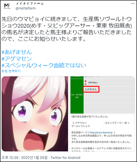 참고로 이 목장엔 아게마셍 외에도 그라스 원더 혈통인 '우마뾰이'도 있다 = 메이타이팜 공식 SNS 갈무리