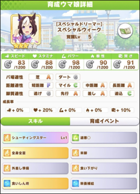이러한 행적을 반영해 게임 내 특성은 중거리와 장거리 A, 선행과 선입 A의 추월마다. 고유 스킬인 '슈팅 스타'는 레이스 종반 전방에서 상대를 추월하면 속도와 가속력이 상승하는 효과를 가지고 있다. 앞서 소개한 일본 더비에서 경기 종반부 선두의 킹 헤일로와 세이운 스카이를 추월해 우승했던 것을 생각해 보면 스페셜 위크 다운 스킬이라 할 수 있다.
