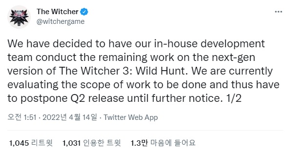 위쳐3: 와일드 헌트의 공식 트위터를 통해 "우리는 현재 수행할 작업 범위를 평가하고 있음에 따라 추후 공지가 있을 때까지 연기 될 것"이라고 밝혔다. 위쳐3: 와일드 헌트의 플레이스테이션5 및 XBOX 시리즈 X 버전의 출시는 오는 2분기로 예정돼 있었다.