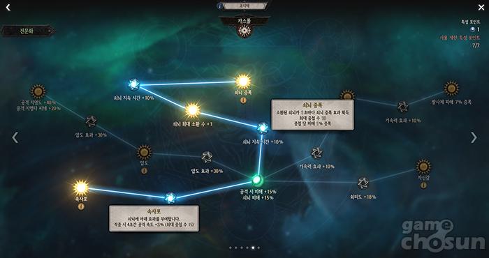조디악 특성의 경우 1티어부터 6티어까지 오직 '쇠뇌'와 관련된 옵션에만 투자를 진행했다. 특히, 전문화 특성의 경우 '카스폴'을 선택해 쇠뇌의 소환 수를 늘리고, 공격을 극대화했다. '속사포'는 적중 시 4초간 공격 속도 +2%의 옵션을 부여하는 특성으로 최대 15 중첩 30%까지 올릴 수 있었다. 쇠뇌 증폭의 경우 1초마다 쇠뇌 증폭 효과를 획득해 피해가 1% 씩 증폭되는 효과였다.