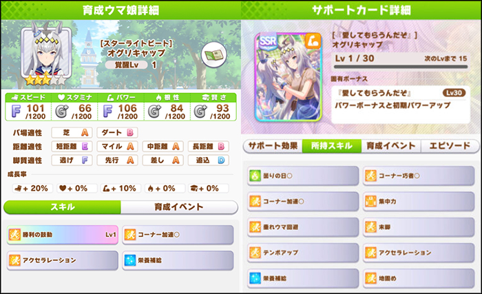 서포트 카드 '사랑받는 거야'는 파워 서포트 카드다. 어떤 말이 사용해도 유용한 스킬들과 육성에 큰 도움을 주는 트레이닝 효과 보너스가 있어 무난하게 좋은 카드다. 일러스트는 인형을 바라보는 오구리 캡의 모습을 그린 것으로 최초의 경주마 인형이 오구리 캡 인형이었던 점을 반영한 것으로 보인다.