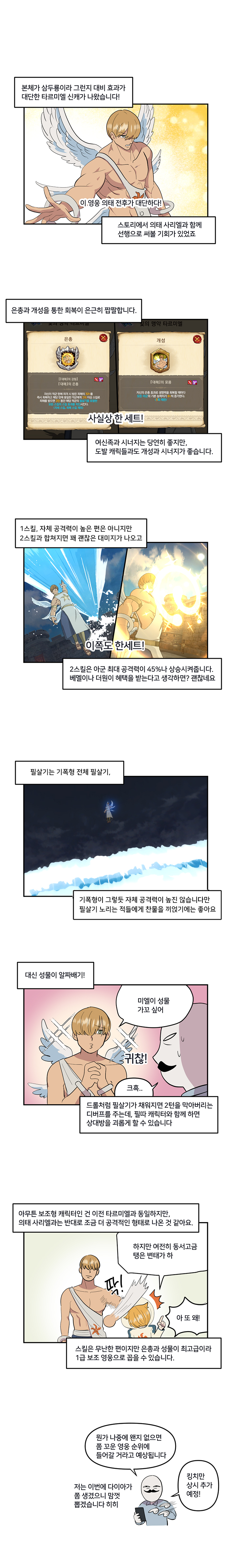 신 타르미엘은 개성과 스킬이 아군 보조에 집중돼 있다. 최대 공격력 45%를 증가시키는 버프가 상당히 유용하다. 또, 개성과 은총이 유기적으로 연결돼 있는데 적에게 피해를 받으면 피해량의 30%를 즉시 회복하는 동시에 아군의 기본 능력치를 최대 30%까지 올려주게 설계돼 있어 생존력과 능력치를 동시에 올려준다.
