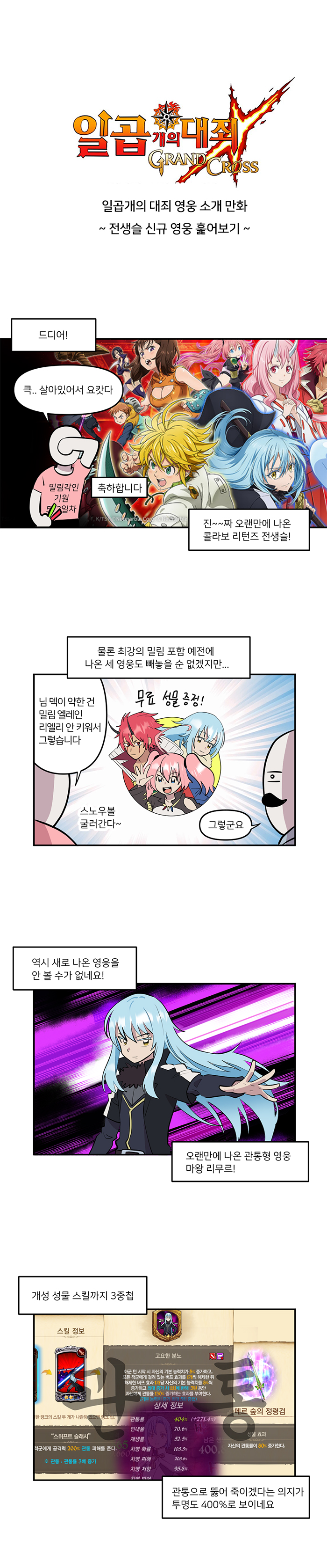 이번 작품은 지난 4월 28일부터 시작된 '전생했더니 슬라임이었던 건에 대하여(이하 전생슬)' 컬래버레이션을 다룬다. 전생슬은 일곱개의대죄 출시 초기 가장 먼저 시작한 컬래버레이션이었는데 3주년이 가까워진 시점에서 다시 진행된 것. 이전 컬레버레이션에서 등장했던 세 명의 영웅 외에도 '마왕 리무르'와 '슈나'가 포함돼 총 5명의 콜라보 영웅이 등장했다.