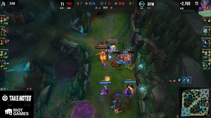 초반부에는 T1과 DFM 모두 팽팽한 경기를 벌였지만, 미드 라인에서 르블랑이 아리를 압도하며 현 시즌 최고 OP 챔피언 중 하나로 지목되는 아리의 존재감을 지웠다. 탑 라인에서는 제이스가 세트를 상대로 압박했다. 오히려 깊숙하게 라인을 민 제이스가 상대 정글의 공격을 받지만, 꾸준히 생존하며 이득을 만들어냈다.