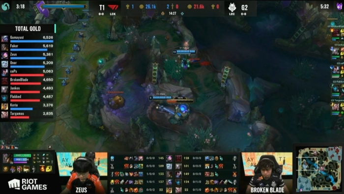 이후 운영도 T1이 원하는 대로 계속 흘러간다. G2가 두 번째 용과 전령을 하나씩 먹을 때 T1은 타워 두 곳을 동시에 공략해 골드 격차를 벌려나갔으며 경기 16분 시점에 킬 차이는 2밖에 안 나는데도 벌써 글로벌 골드 격차를 5천 골드나 내버린다.