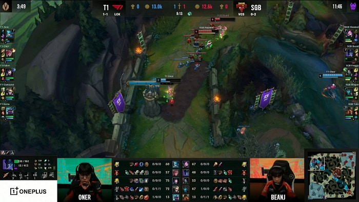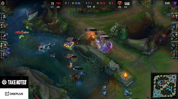 다만 SGB도 쉽게 경기를 내주지 않았다. 미드 2차까지 깊숙이 들어온 T1을 5명 전원이 양 사이드에서 덮치며 한타를 승리, 아칼리를 성장시키며 반등을 노린다. 이에 질세라 T1도 대치 상황에서 아칼리를 우선해서 잘라주는 등 반격의 여지를 차단시키며 주도권을 유지한다.
