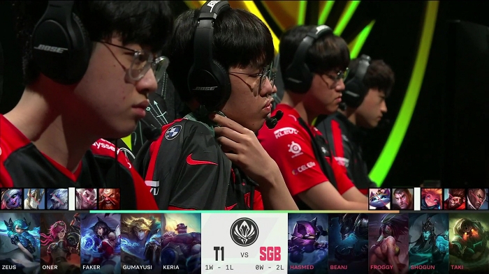 T1은 그웬, 바이, 아리, 이즈리얼, 브라움을, SGB는 케넨, 녹턴, 아칼리, 칼리스타, 노틸러스를 선택했다. 바텀 라인전이 꽤 힘들 것으로 예상됐으며 실제로도 시작부터 이즈리얼이 얻어맞으며 위태롭게 게임을 시작, 퍼스트 블러드를 칼리스타에게 헌납하고 만다.