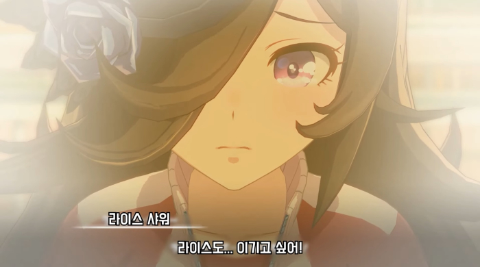 애니메이션에선 약간 다른 양상으로 줄거리가 진행된다. 모두를 행복하게 만들고 싶었던 라이스 샤워는 미호노 부르봉을 꺾은 뒤 자신에게 쏟아지는 비난에 힘들어한다. 이후 미호노 부르봉의 격려로 메지로 맥퀸과 대결할 결심이 서지만, 애니메이션에선 게임과 다르게 집념에 가까운 훈련과 정신력으로 자신을 몰아붙인다.
