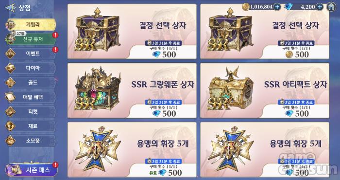 유저들이 가장 쉽게 얻을 수 있는 보상은 '500일 기념 게릴라 상점' 이벤트다. 무료 다이아 500개로 SSR 그랑웨폰 상자 1개를 얻을 수 있을 뿐만 아니라 SSR 아티팩트 상자, 용맹의 휘장, 결정 선택 상자, 성목의 은총까지 무료 재화로 구입할 수 있다. 출석 보상만으로 SSR 그랑웨폰 상자와 아티팩트 상자를 둘 다 구입할 수 있는 수준의 다이아를 얻을 수 있고, 출석 보상을 다 쓰더라도 일일 업적과 기사단 회관, 환원을 이용하면 쉽게 해당 상품을 구입할 수 있다.