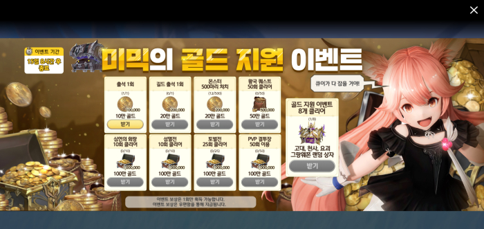 미믹의 골드 지원 이벤트는 간단한 미션으로 고대·천사·요괴 그랑웨폰 상자를 얻을 수 있는 이벤트다. 총 8가지 미션이 제시되며, 이를 모두 완수하면 고대·천사·요괴 그랑웨폰 랜덤 상자를 하나 얻는다. PVP 결투장 50회 이용 미션을 제외하면 난이도를 낮춰 빠르게 완수할 수 있기 때문에 꾸준히 게임을 즐기면 쉽게 고대·천사·요괴 그랑웨폰을 손에 넣을 수 있다. 모든 미션을 수행하면 고대·천사·요괴 그랑웨폰뿐만 아니라 500만 골드를 얻을 수 있어 장비 성장에 유용하게 사용할 수 있다.