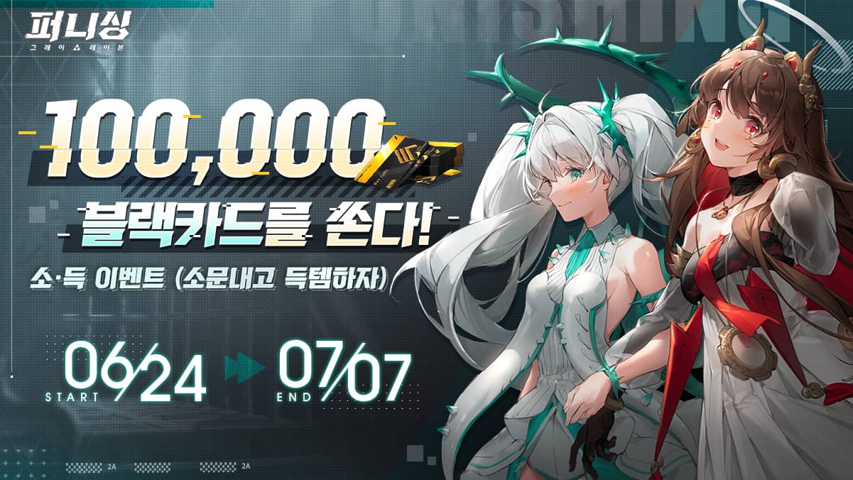 우선 커뮤니티 내에서 이벤트가 열린다. 오는 7월 8일부터 8월 8일까지 퍼니싱 공식 유튜브 계정 응원하기 이벤트가 진행되며, 100,000 블랙카드를 쏘는 소득 이벤트(소문내고 득템하자)가 6월 24일부터 7월 7일까지 진행된다.