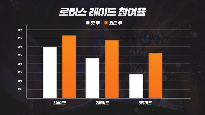 이후 지속적인 업데이트를 통해 레이드를 도전하던 모험가가 3페이즈까지 도달하는 비율이 높아진 점은 고무적이나 레이드 1페이즈 참여율이 여전히 그대로라 도전 자체에 대한 부담감을 느끼고 있는 유저가 많다며 이에 대한 보완책을 해결하겠다고 설명했다.