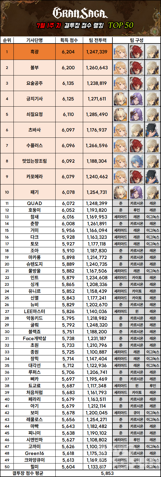 ■ 점수 랭킹 1위 '흑광', 상위권에 부는 물속성 파티 바람