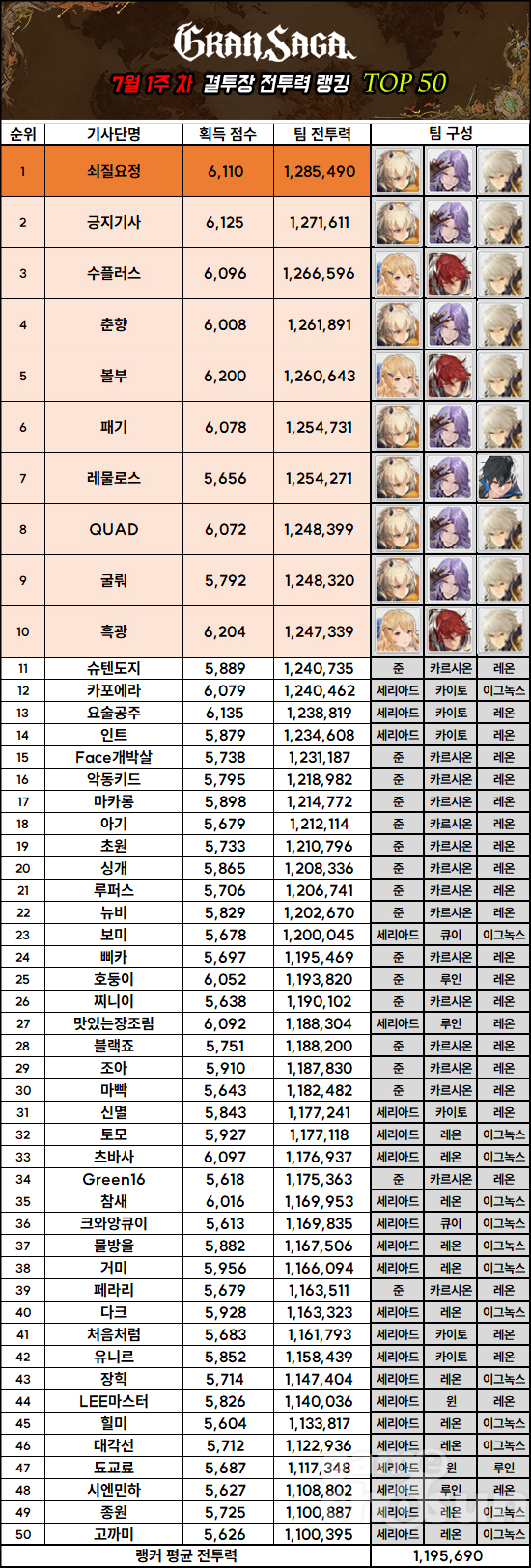 결투장 전투력 랭킹 1위를 이어가는 '쇠질요정'이 파티를 다시 '레온, 카르시온, 준'으로 변경했다. 전투력은 45,541 상승한 1,285,490이며, 2위 '긍지기사'와 차이는 13,879다. 평균 전투력은 31,795 상승한 1,195,690으로 상위권 랭커들이 이그녹스를 채용하면서 하락했던 평균 전투력을 한 주만에 완벽히 회복했다.