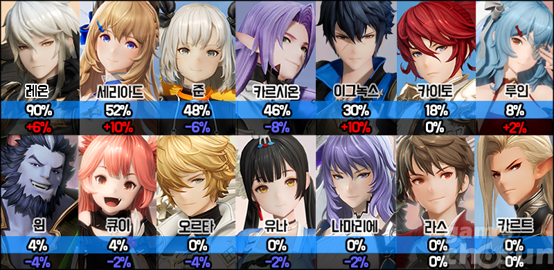 그랑나이츠의 대장님 '레온'이 또 90%를 찍었다. 이번엔 부하를 바꿔 카르시온 대신 이그녹스와 세리아드와 함께 차세대 메타 파티를 넘보고 있다. 게다가 세리아드는 52%를 기록하며 오랜만에 2위에 올라섰다. 이그녹스 역시 이번 주 10%에 달하는 점유율을 추가로 얻으며 드디어 30% 고지의 문턱을 밟았다.
