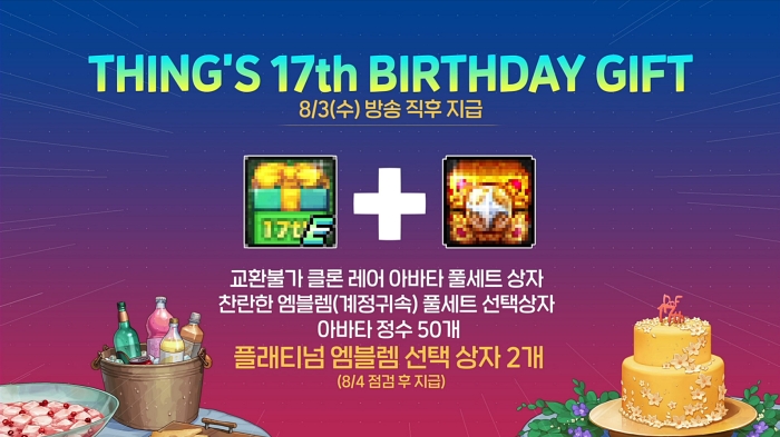 또한 던파 유저를 위한 선물도 세 차례에 걸쳐 공개했다. 8월 4일 점검 후 교환불가 클론 레어 아바타 풀세트 상자, 찬란한 엠블렘 풀세트 선택상자, 아바타 정수 50개, 플래티넘 엠블렘 선택 상자 2개를 바로 지급한다. 이후 17주년을 기념해 17개의 간단한 미션을 수행하고 피해 증가 17% 크리쳐, 준 졸업급 마법 부여 보주 등 풍성한 보상을 제공할 예정이다.