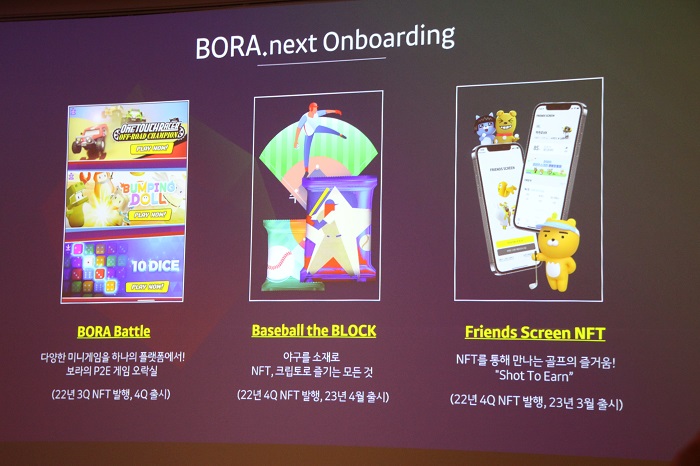 조계현 대표는 "블록체인과 토크노믹스가 결합되면 게임이 어떤 재미를 보여줄 수 있을지 충분히 고려하고 있다"라고 언급했으며, "웰메이드 블록체인의 경험을 선사하겠다"라고 전했다. 이외에도 보라 배틀과 베이스볼 더 블록, 프렌즈 스크린 NFT 등도 소개했다. 보라 배틀은 다양한 미니게임을 하나의 플랫폼에서 만나볼 수 있는 작품으로, 보라의 P2E 게임 오락실로 올해 3분기 NFT 발행 4분기 출시 예정이다. 야구를 소재로한 NFT, 크립토로 즐기는 모든 것이 담겨져 있으며 올해 4분기 NFT를 발행하고 23년 4월 출시한다.