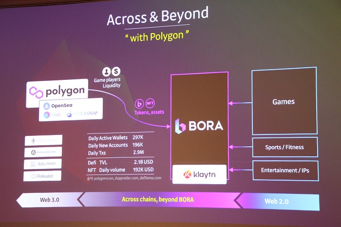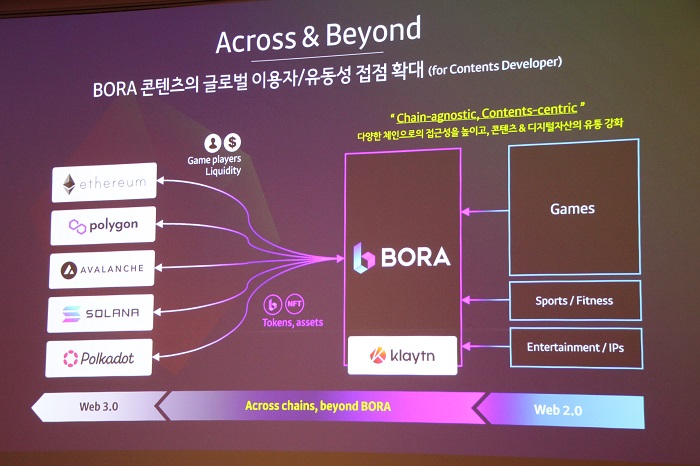 우상준 대표는 "보라가 성장이 아닌, 팽창하기 위해서는 글로벌 게이머를 만나야하며 이들을 만나기 위해, 크로스체인 구축을 구상하게 됐다"라고 말했다. 크로스체인은 보라가 가지고 있는 콘텐츠와 게임을 유저에게 딜리버리한다는 개념이다.