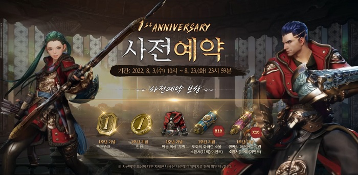 다채로운 보상이 제공되는 1주년 기념 관련 이벤트도 마련됐다. 1주년 기념 사전예약 시, 공격력/명중/방어력이 각 5씩 증가하는 '1주년 기념 인장'과 경험치 획득량 증가 +10% 및 공격력/ 명중이 각 2씩 증가하는 '1주년 기념 증표', 특별 영웅 의상 '부활', 소울 및 수호령 소환 11회권 각 10개를 지급한다.