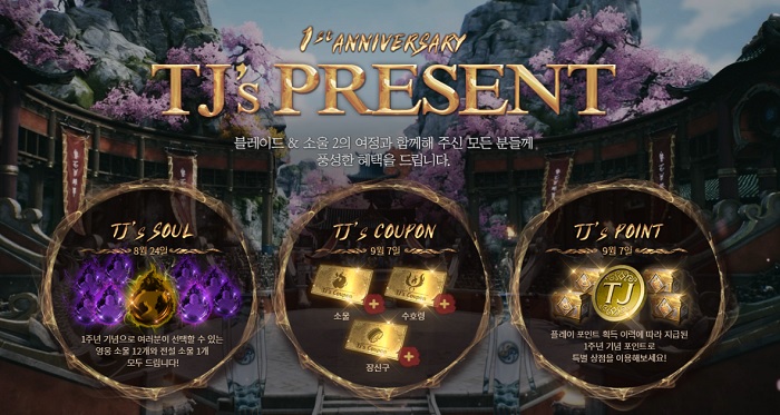TJ's의 선물도 빼놓을 수 없는 혜택 중 하나다. 8월 24일 이용자가 직접 영웅 소울 12개와 전설 소울 1개를 선택할 수 있는 TJ's 소울을 제공하며, 9월 7일에는 과거 진행한 가장 높은 등급의 소울 및 수호령, 장신구 합성을 재시도할 수 있는 TJ's 쿠폰을 받을 수 있다. 또 플레이 포인트 획득 이력에 따라서 1주년 기념 포인트가 주어지며, 해당 포인트로 특별 상점에서 높은 가치의 아이템과 교환 가능할 예정이다.