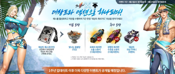 패스권의 미션은 경공 및 출석 등 블소2를 즐기는 이용자라면 누구나 완수할 수 있도록 구성돼 있으며, 데상트 의상 주머니에서는 기간 한정 데상트 래쉬가드 의상을 획득 가능하다.