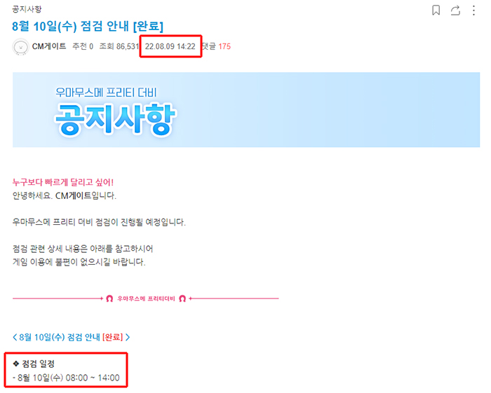 확률 상승 이벤트 종료 직전에 업데이트를 넣고, 그 업데이트 공지를 18시간 전에 게재 = 우마무스메 프리티 더비 공식 홈페이지 갈무리