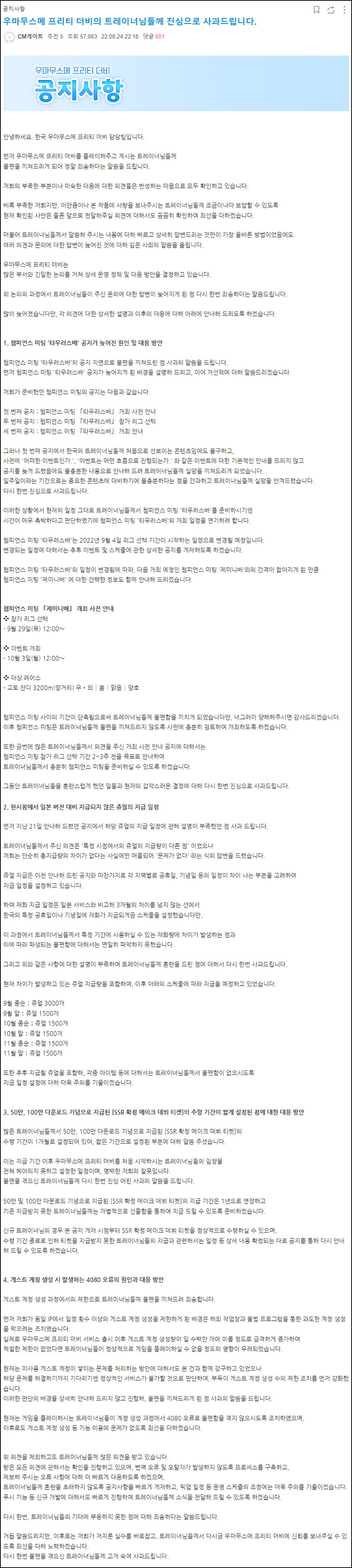 우마무스메 프리티 더비는 최근 국내 서비스 차별 이슈로 인해 몸살을 앓고 있다. 유저들은 일본 서버 대비 적은 유료 재화 배포와 불친절한 업데이트 안내, 각종 운영 이슈에 대해 불만을 제기하는 중이며, 이에 카카오게임즈는 24일 사과문을 통해 4가지 논란에 대한 답변을 내놓았다.