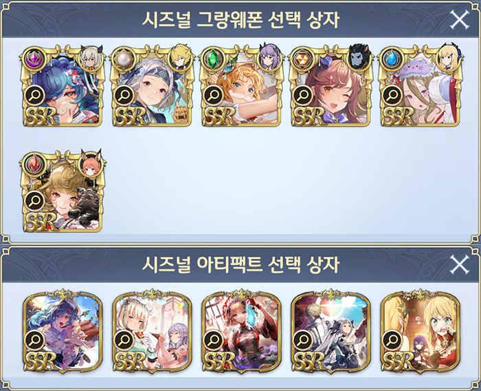 다음은 시즈널 그랑웨폰과 시즈널 아티팩트, 고대·천사·요괴 그랑웨폰 판매다. 이번 상품은 광휘의 그랑 쥬얼과 신록의 그랑쥬얼로 구입 가능하며, 판매 기간은 2주다. 상품 목록과 입수 가능한 시즈널 그랑웨폰, 시즈널 아티팩트 목록은 다음과 같다.