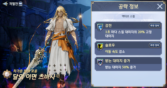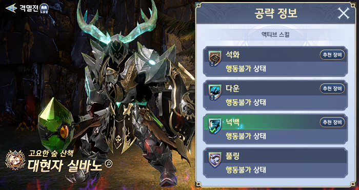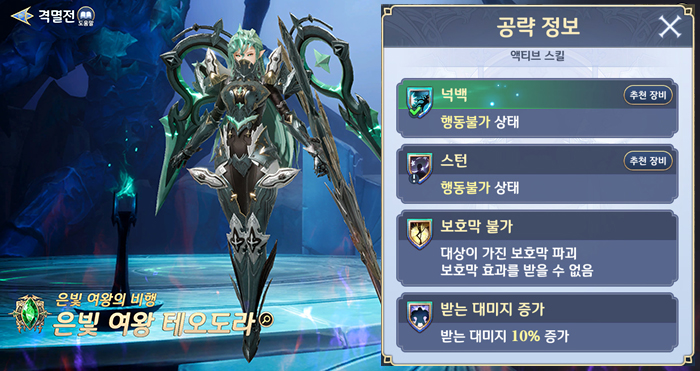이번 업데이트의 핵심은 격멸전이다. 격멸전은 오르타, 윈, 나마리에의 변신 그랑웨폰인 츠바사, 실바노, 테오도라와 싸우는 전투 콘텐츠다. 보스에 따라 신규 세트 장비 아이템을 2종류씩, 총 6종류를 얻을 수 있다. 격멸전은 챕터 10 에피소드 20 이후 입장 가능하며, 토벌전에서 일정 확률로 획득하는 격멸전 인장을 소비해 도전할 수 있다. 이하는 각 보스의 주요 상태 이상 공격과 보상 장비의 세트 옵션이다.