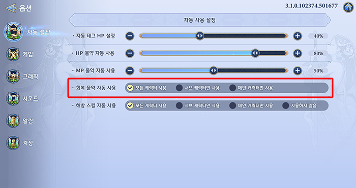 먼저 회복 물약 자동 사용은 옵션의 회복 물약 자동 사용 항목에서 지정 가능하며, 모든 캐릭터 사용을 지정했을 경우 팀 전투에서 자신이 조종하지 않는 나머지 두 캐릭터가 자동으로 물약을 사용한다. 단, 서브 캐릭터가 물약을 사용하면 재사용 대기 시간이 적용되어 메인 캐릭터가 물약을 제때 사용하지 못하는 경우가 있으니 상황에 맞춰 사용하자.