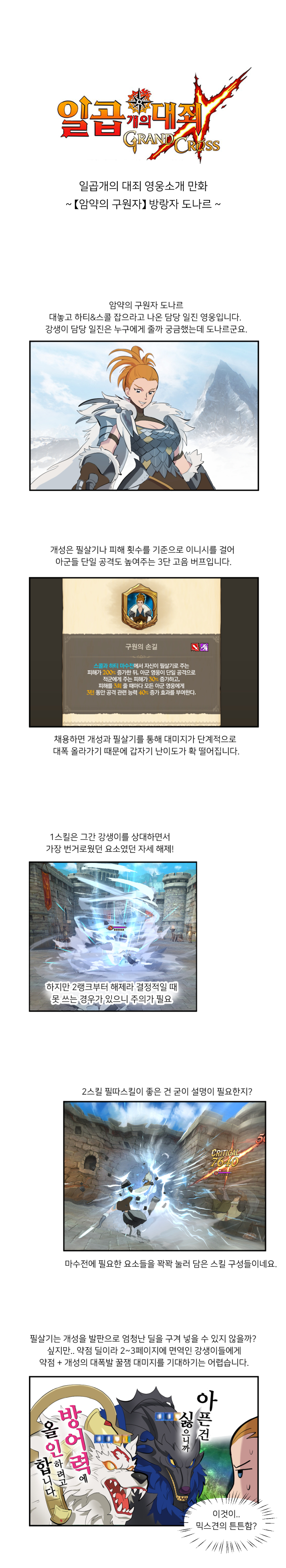 그 외에도 마수전에서 까다로운 자세를 해제하거나 필살기를 견제하는 스킬도 있어 사실상 '하티&스콜' 단 하나에 쓰이는 영웅임에도 꼭 가져야 하는 영웅으로 꼽히고 있는 중이다. 두 번 연속 특정 콘텐츠 전용 영웅으로 나온 도나르의 모습을 웹툰으로 확인해보자.