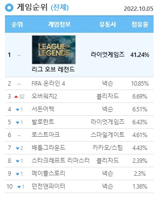 PC방 온라인 게임 순위, 통계 서비스를 제공하는 '더 로그(The Log)'에 따르면 5일 기준 오버워치2는 점유율 6.69%를 달성하며 리그오브레전드와 피파온라인4에 이어 3위에 올랐다. 오버워치2가 3위에 오르면서 유사한 FPS 장르 게임 서든어택과 발로란트를 비롯해 많은 게임들이 한 계단씩 내려갔다.