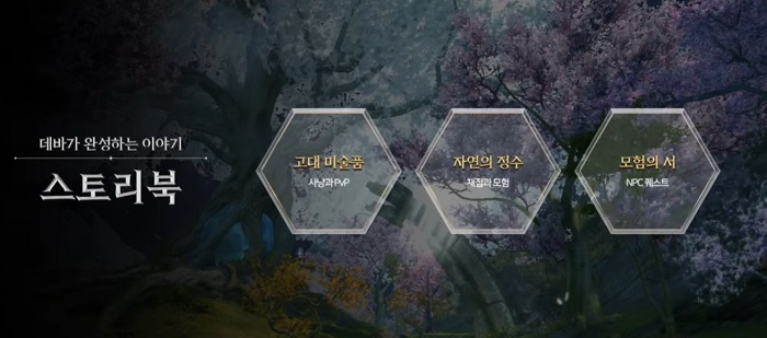 다음으로 소개한 것은 '스토리북'이다. 스토리북은 사냥과 PvP로 완성하는 고대 미술품과 채집과 모험으로 완성하는 자연의 정수, 그리고 NPC 퀘스트를 통해 완성하는 모험의 서로 구성돼 있다. 각 스토리북을 완성할 경우에는 다양한 원화 혹은 숨겨진 스토리를 감상할 수 있다.