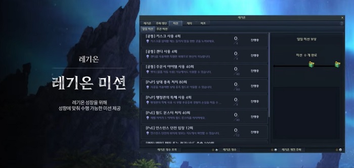 레기온의 핵심 콘텐츠도 공개됐다. 레기온 검색 가입 기능을 도입하면서 레기온 주요 활동 항목을 추가했다. 또 당분간은 주요 활동 체크와 관계없이 레기온 미션이 제공되며, 추후에는 레기온 성향에 맞는 미션만 수행 가능하도록 하겠다는 계획을 전했다.