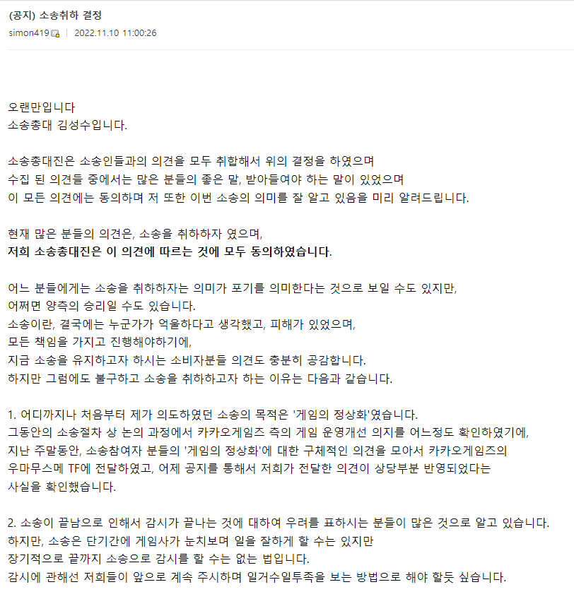 이후 '우마무스메 프리티 더비 마이너 갤러리'를 중심으로 결집한 환불 소송 총대진 측은 당초 목적인 '게임의 정상화'가 어느 정도 이뤄졌고 카카오게임즈 측의 운영개선 의지를 확인하였기에 소송비를 입금한 인원들에게 설문조사를 실시할 것이라 밝혔고, 최종적으로 소송취하가 결정됐음을 공지하며 긍정적인 신호를 보내온 상황이다.