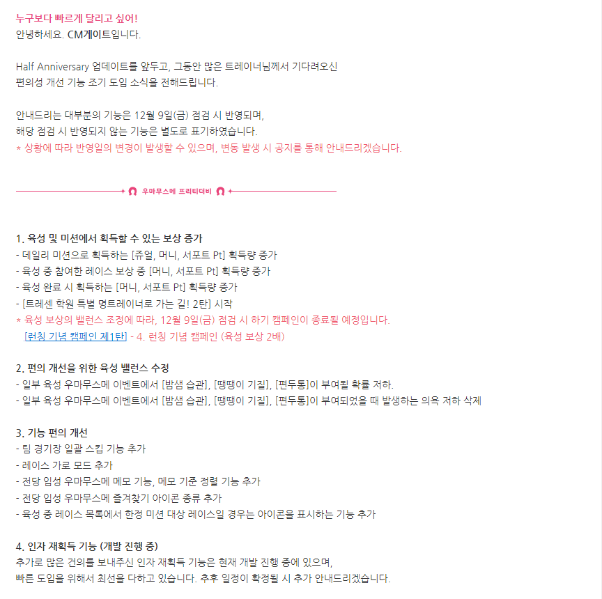 지난 11월 9일 올라온 공지사항에는 캠페인으로 적용하고 있던 육성 및 미션 보상 증가를 상시 적용으로 변경하고 육성 과정 중에 발생하는 배드 컨디션의 발생 확률 하향과 추가 악영향이 사라지는 개선이 적용될 것이며, 그 밖에도 팀레이스 일괄 스킵-전당 우마무스메 인터페이스 기능 추가-레이스 가로 모드 추가, 무점검 업데이트 등 다양한 기능 편의 개선이 12월 9일 점검 시 적용될 것이라 밝혀 이용자들로부터 좋은 반응을 얻고 있다.
