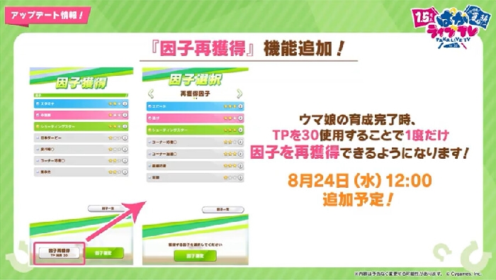 특히, 육성 우마무스메의 결과 단계에서 TP를 추가 소모하여 인자를 재설정하는 기능이 조기 도입될 것임을 시사했는데 이는 일본 서버에서도 고작 3개월 전, 1.5주년 기념 업데이트에서야 적용된 최신 기능으로 육성 피로도를 획기적으로 줄일 수 있어 호평을 받은 내용이다.
