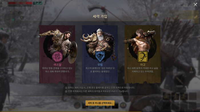 A. 두 개의 세력을 다루거나, 세 개의 세력을 다루는 MMORPG는 있었으나 두 개의 세력에 하나의 용병 세력이 합쳐진 이러한 방식은 아마 대중적인 게임에선 처음일 거라 생각한다. 아고와 아스달은 여러 세력 미션을 수행하며 세력에 기여하는 생활을 하게 되고, 또 하나의 세력인 무법 세력은 오로지 전쟁을 좋아하는 유저들이 양쪽 세력에 용병으로써 전쟁에 참여하게 되는 역할로 두 세력의 균형추 역할을 하게 된다. 일정 주기로 계산되는 세력의 균형에 따라 약세 세력 쪽으로의 용병 보상에 변동이 생기며 무법 세력은 약세 세력에서 용병 역할을 하며 두 세력 간의 균형을 잡게 만든 방식과 이 과정에서 연맹 간의 정치 경제적인 이권 다툼이 이 게임의 차별화 포인트가 될 것이다.