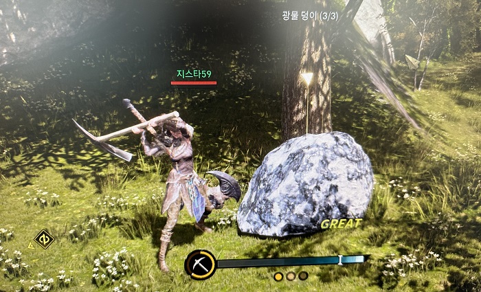 아스달 마을에 도착한 후에는 채광과 채집, 제작, 요리 등 다양한 생활형 콘텐츠를 만나볼 수 있다. 생활형 콘텐츠는 미니 게임 형태로 진행되며 미니 게임의 결과에 따라 획득하는 보상량이 달라졌다. 비가 내려서 하천에 물이 흘러야만 낚시를 할 수 있도록 설계한 부분도 인상 깊었다.
