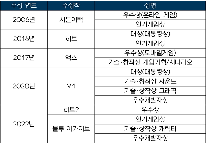 넥슨게임즈의 게임대상 수상은 지난 2006년부터 시작되었다. 올해 3월 31일 넷게임즈와 합병한 넥슨지티의 ‘서든어택’이 2006년 온라인게임 우수상과 인기게임상을 수상한 것. 이후 모바일 액션 RPG ‘히트’가 정식 오픈 후 15일 만에 200만 다운로드를 돌파하는 등 흥행에 성공하며 2016년 대한민국 게임대상 대상(대통령상)과 인기게임상을 수상했다. 2017년에는 넥슨지티의 자회사인 넥슨레드가 개발한 모바일 MMORPG ‘AxE(액스)’가 모바일게임 우수상, 기술·창작상 게임기획/시나리오 2개 부문에서 수상했으며, 2020년에는 모바일 MMORPG ‘V4’가 대한민국 게임대상 대상(대통령상), 기술·창작상 사운드 부문, 기술·창작상 그래픽 부문, 우수개발자상을 수상, 4관왕을 차지한 바 있다.