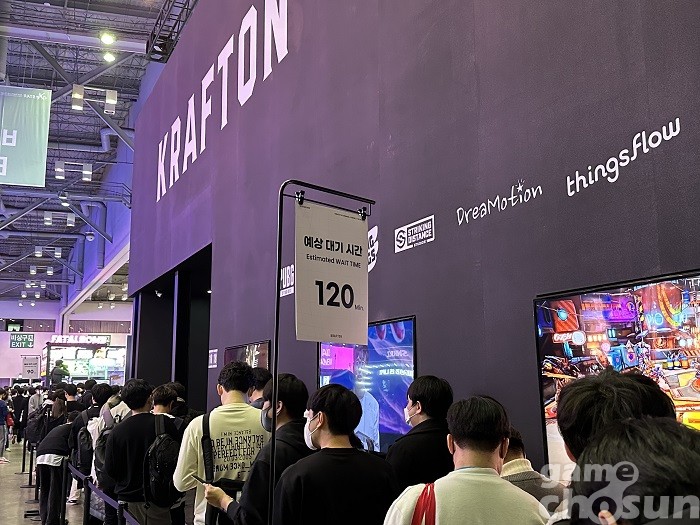 지스타 2022 개막일부터 많은 관람객이 찾은 크래프톤 부스는 휴일에는 더욱 많은 이들이 방문하면서 긴 대기열을 형성했다.