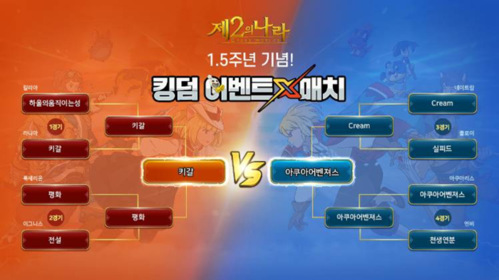 넷마블의 MMORPG '제2의 나라' 1.5주년 기념 킹덤 이벤트 매치 결승 진출 킹덤은 라니아 서버 '키갈'과 아쿠아리스 서버 '아쿠아어벤져스'로 결정됐다.