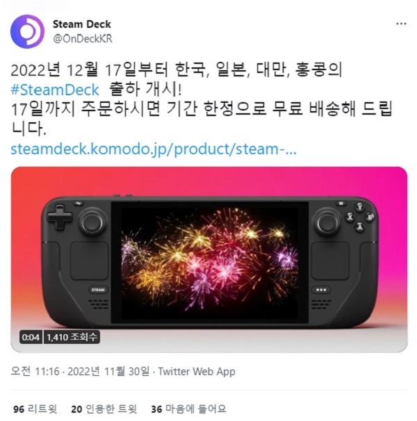 코모도는 30일 공식 트위터 채널을 통해 밸브 코페레이션에서 개발한 휴대용 게이밍 PC '스팀 덱'의 동아시아 지역 출고가 오는 12월 17일부터 시작될 것이라 밝혔다.